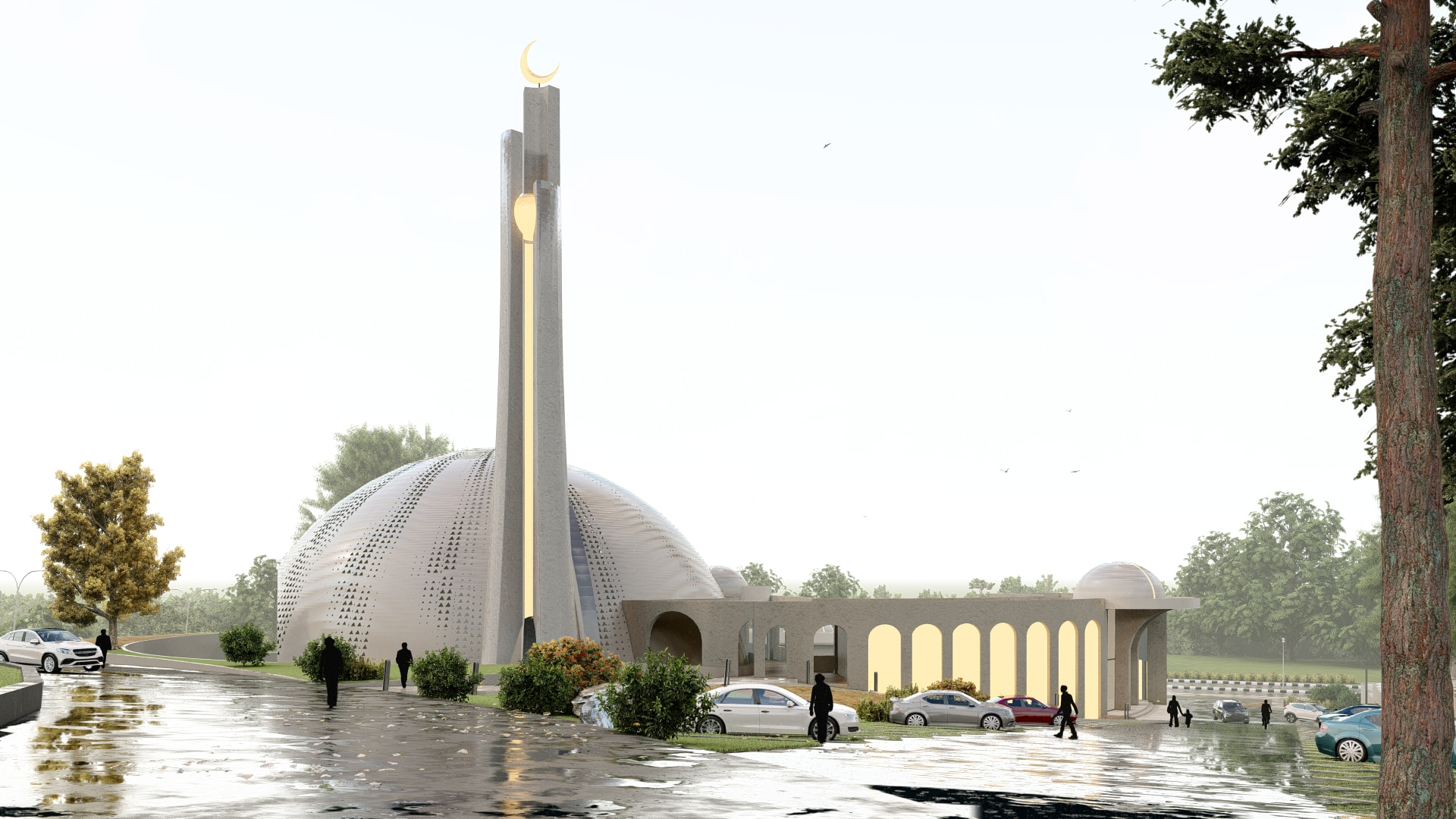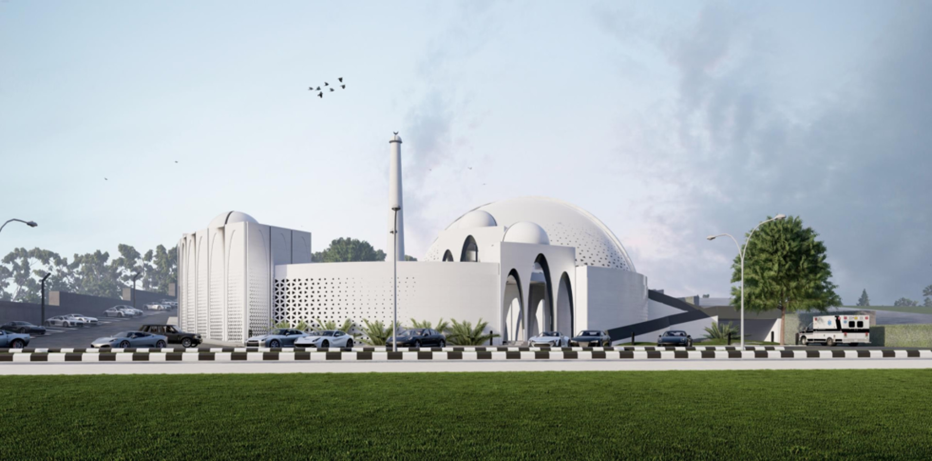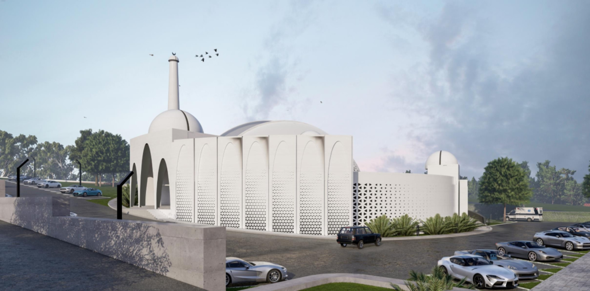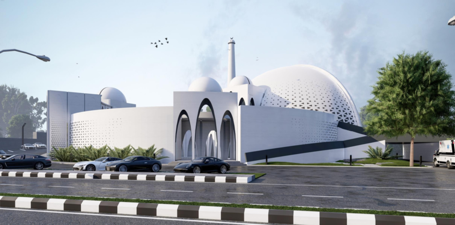 Located in a residential zone, the mosque features an octagonal form, with each side featuring its own unique identity while simultaneously being part of the whole. Modern perforations break the solidity of the mass, while geometric stars adorn the dome. The white color palette makes the mosque stand out, while its contemporary minaret showcases its identity from afar.