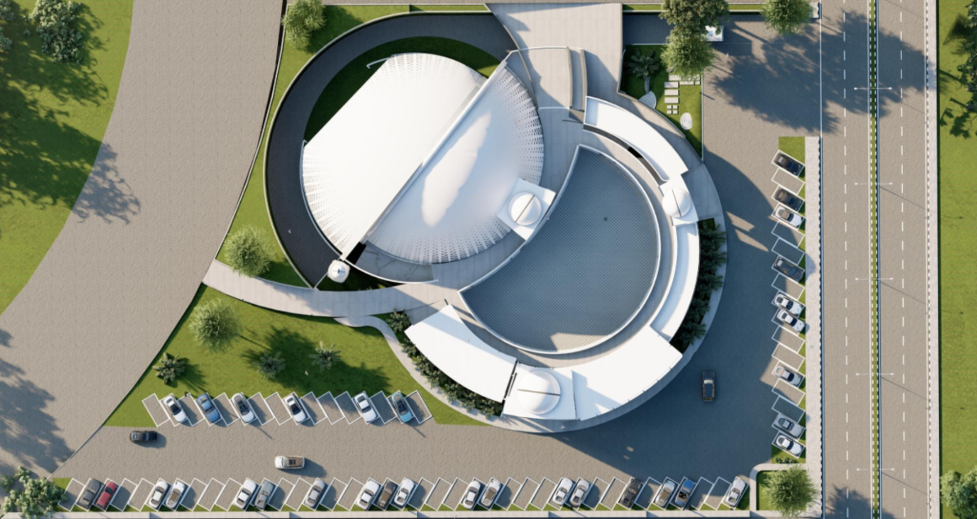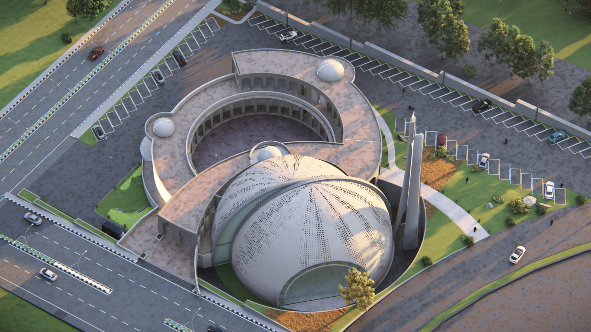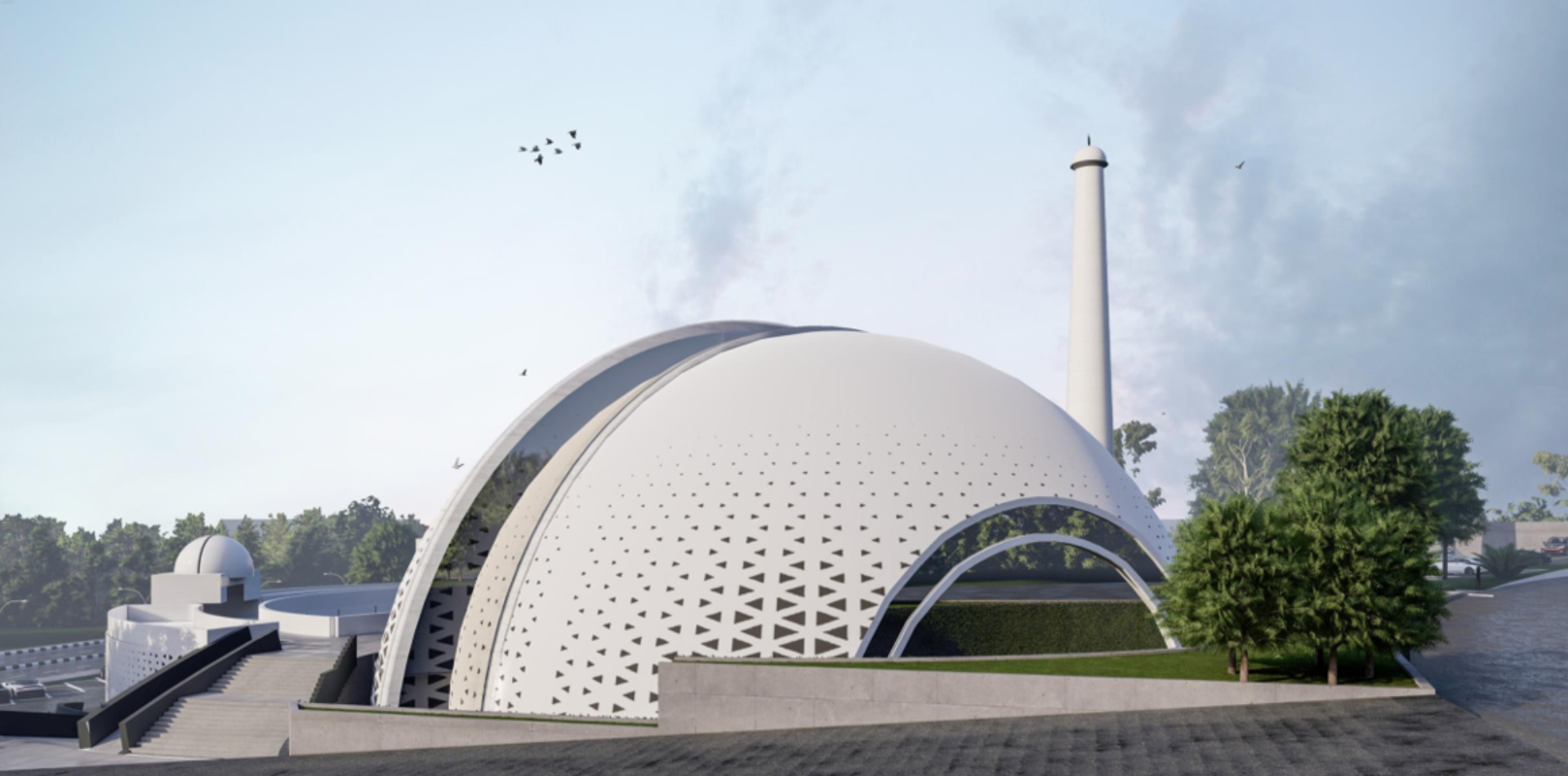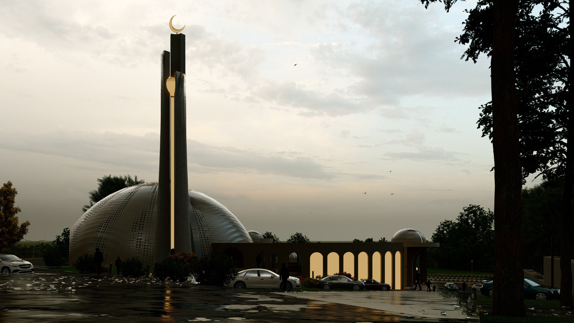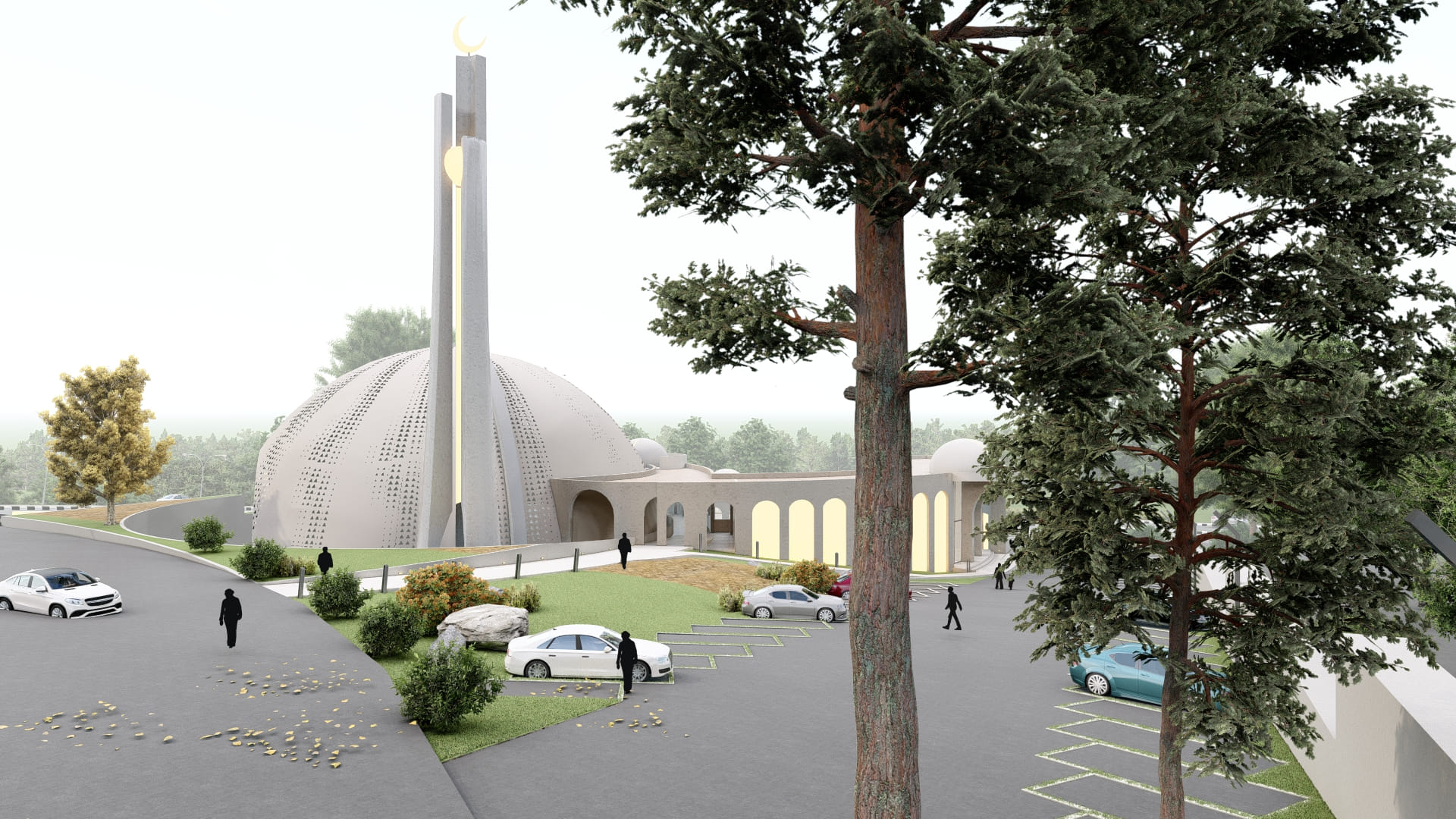 Located in a residential zone, the mosque features an octagonal form, with each side featuring its own unique identity while simultaneously being part of the whole. Modern perforations break the solidity of the mass, while geometric stars adorn the dome. The white color palette makes the mosque stand out, while its contemporary minaret showcases its identity from afar.