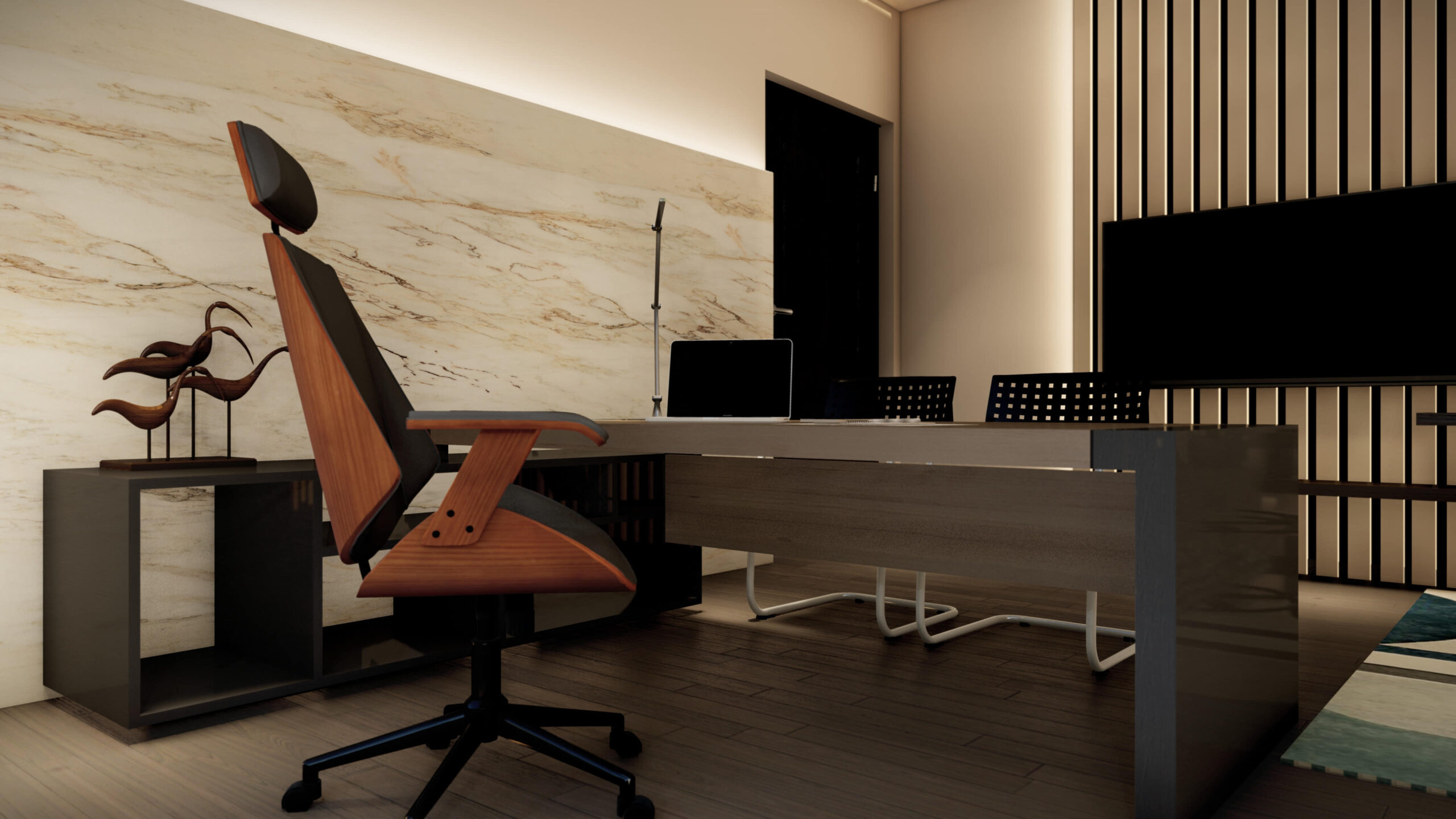 Description:A small private office space that’s designed with warm luxury in mind. The use of warm materials and color palettes, contrasted with neutral whites to create a sense of both openness and coziness.